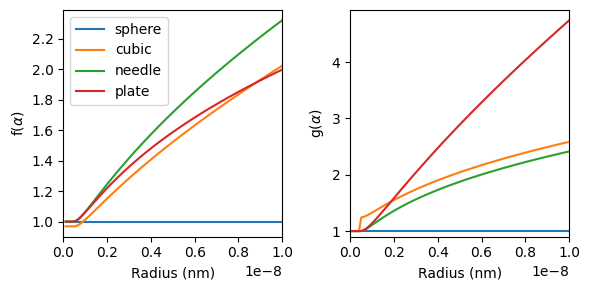Currently, the KWN model has support for ellipsoidal (prolate/needle and oblate/plate) and cuboidal precipitates. For cuboidal precipitates the cubic factor currently set constant at $\sqrt{2}$ [3,4]. These shapes are defined in the KWN model by their equivalent spherical radius ($R_{sph}$) and an aspect ratio ($\alpha$), where the $\alpha$ can either be constant or as a function of $R_{sph}$.