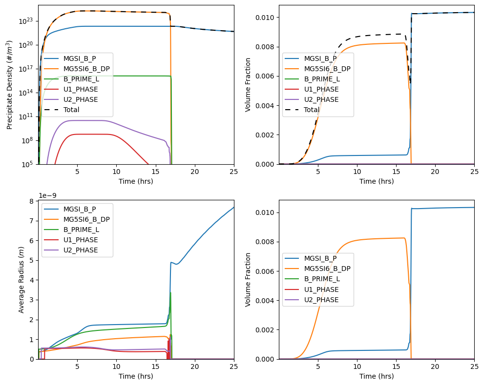 55 plotPrecipitateDensity(model, ax=axes[0,0], timeUnits='h', phases=phasesPlusTotal, label={'Total': 'Total'}, color={'Total': 'k'}, linestyle={'Total': (0,(5,5))})