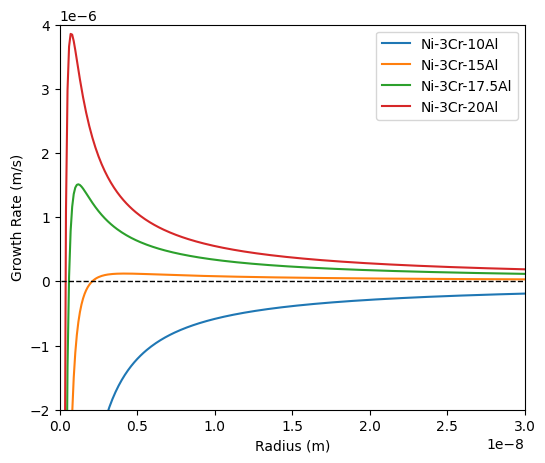 This gives 2N-1 equations to solve, which can be time consuming and, in worst cases, a solution may not be found. At small saturations, the growth rate can be determined through local expansion of the chemical potential at equilibrium (Philippe and Voorhees, 2013). The growth rate (assuming $\Delta G_{el} = 0$ for simplicity) then becomes: